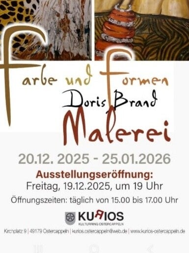 Begleiten Sie mich auf meiner Ausstellung und tauchen Sie mit mir in die Kunst ein. Vom 20.12.2025 bis zum 25.01.2025 von 15.00 bis 17.00 Uhr stelle ich meine Bilder in der Alten Mädchenschule in Ostercappeln, Kirchplatz 9 aus . Ich freue mich sehr auf Ihren Besuch.